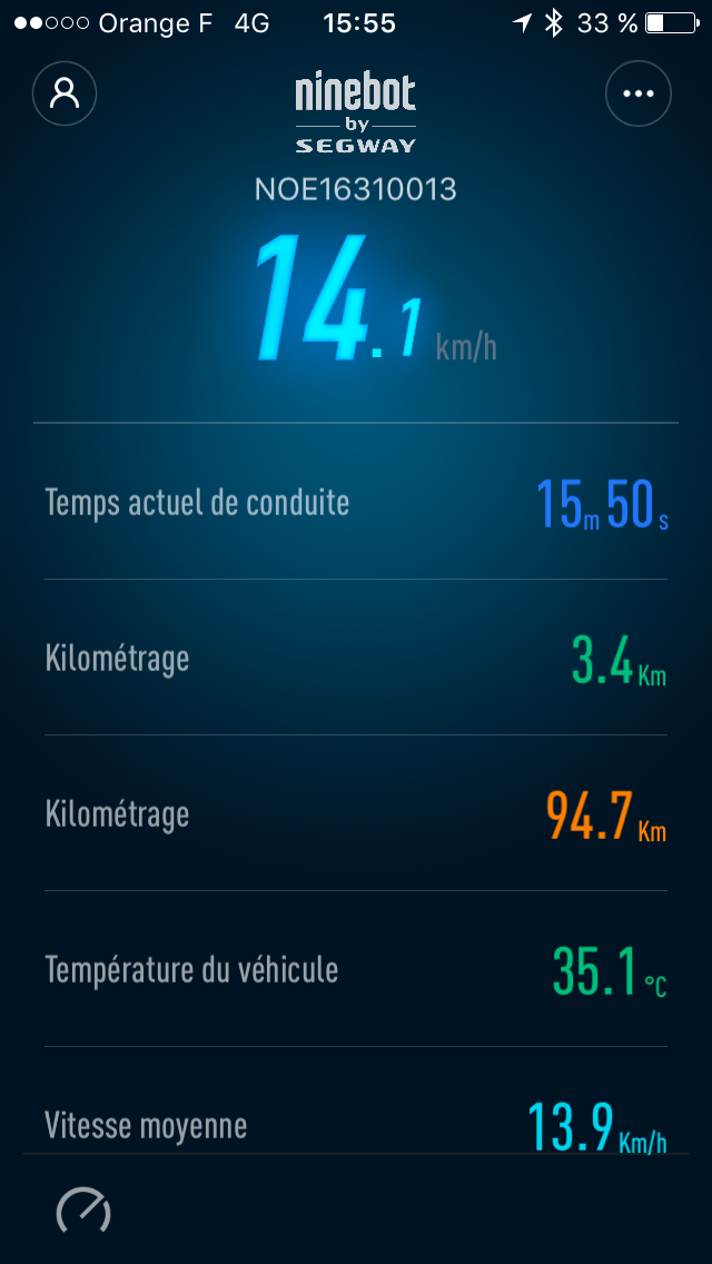 L’appairage avec le téléphone mobile se fait très simplement. On découvre toutefois rapidement que l’application Ninebot n’est d’aucune utilité lorsque la roue n’est pas allumée. Ça n’est pas forcément très gênant lorsqu’on conduit, mais c’est agaçant de devoir allumer sa roue lorsqu’on souhaite juste consulter le niveau de la batterie ou le kilométrage du véhicule qui pourraient simplement être mis en cache.